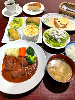 お食事はママシェフ手作りの和洋折衷料理をお出ししております。アットホームな雰囲気の中で『手作り』にこだわるママは、自家栽培の野菜など地元の味をお客様に楽しんでいただくために日々土にまみれています。お客様の好みに合わせて色々なお料理とデザートを夕食では楽しんでいただいております。デザートはチーズケーキやチョコレートファウンテンなど甘い楽しさも喜んでいただいております。